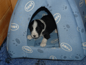 Heute ist der Distanzrahmen aus der Kiste entfernt wird. Der Rahmen am Rand der Kiste sorgt dafür, dass die Mutter nicht versehentlich einen Welpen erdrückt, der hinter ihr liegt. Die sieben Zwerge fanden den Distanzrahmen toll: man kann drunter krabbeln, den Kitzel genießen, dass man inzwischen fast stecken bleibt, den Hals ganz lang machen und oben drauf legen. Und jetzt kann man auch hochkrabbeln, über den Kistenrand lugen, sich über den Rand hieven und sich von der Truppe entfernen! Wenn das das erste Mal passiert, muss der Rahmen raus und dann besteht auch die Gefahr des Erdrückens nicht mehr.