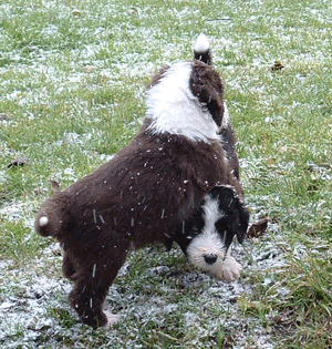 Wir warten schon so lange auf Schnee. Heute kommen endlich sachte Anfänge.Die Welpen mögen den Schnee, auch Indian Summer hat sich nicht vor dem Winter versteckt, sondern mit den Geschwistern Verstecken gespielt.