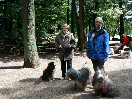 | Ganz rechts sehen Sie Amy als stolze Siegerin: 1. und 2. Platz! Links daneben mein Bochdi, der mit ihr zusammen den 2. Platz errungen hat. Wobei wollen Sie wissen?Gestern war "Sommer"fest vom Club für britische Hütehunde Hamburg in Ammelinghausen. Unser neuer Sportwart hatte sich als sportliche Einlage einen witzigen Parcour ausgedacht: Es galt mit dem Hund an der Leine in Schlangenlinien zwischen Bäumen hindurch zu laufen oder gehen, einen echten Slalom zu absolvieren, über ein kleines Hinderniss zu springen und dann zwischen zwei Bäumen eine kleine Limbo-Übung zu absolvieren. Puppeneinfach sagen Sie? Von wegen! Die gleiche Hand, die den Hund führte, musste auch ein Tablett mit Wasserbechern ans Ziel bringen. Und dann musste man noch vorher ansagen, welche der drei angebotenen Leckereien der Hund fressen fressen würde.