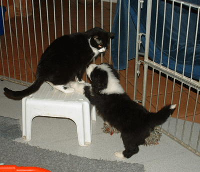 | Zirkusübungen: Tinka muss als Stubentiger auf das Podest und Holly versucht ihr zu erklären, was sie tun soll. weitere Trainingsübungen für die große Vorstellung können sie im Welpenkalender betrachten.