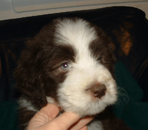 | So sieht Coffee jetzt aus. Die Augenfarbe verändert sich langsam, "in echt" sind sie dunkler als auf dem Bild. Sie können aber sehen, dass es nicht mehr das Blau der Babyaugen ist. Die Schwarzen haben inzwischen zwar nicht gut - aber Sie sollten diese Farbe mal sehen! Ich habe versucht, sie auf's Bild zu bannen, aber das geht an einem so tristen Tag wie heute nicht.Was die Welpen heute machen, sehen Sie im Welpenkalender.