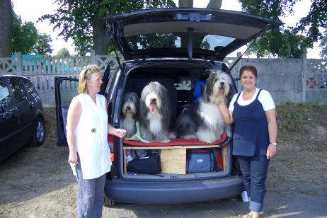 | Ab und zu muss man dem europäischen Ausland ja doch vor Augen halten, wioe schön die deutschen Briten sind. Mit diesem Auftrag sind wir diesmal nach Legnica in Polen gefahren. Eigentlich müssten diese Touren von Autofirmen gesponsert werden, diesmal könnten wir für das Fassungsvermögen eines VW-Caddy Reklame machen: Die große Bobtail-Perle, Finn und Fine haben sich friedlich und entspannt über viele Kilometer die Ladefläche geteilt. Ich weiß, jetzt kommt. "Na und, das ist doch nichts!" Aber hinter den Rücken von Finn und Fine stand noch eine große Box, in der Campino und Gershwin gemütlich gereist sind. Es war dann auch noch Platz für drei Frauen und all deren Reisegepäck, zwei Kämmtische, eine weitere Stoffbox, Kämmutensilien, Menschen- und Hundefutter.