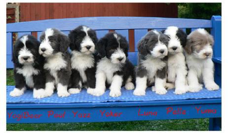 | Vor fast zehn Jahren waren wir das erste Mal bei Bückers. Der Vater von Paulas ersten Welpen sollte August the Joybringer werden. Unterwegs war ich noch fast erstarrt vor Ehrfurcht vor den bekannten und erfolgreichen Züchtern, die wir nun gleich kennen lernen sollten. Die Erstarrung wurde schnell gelöst, weil Bückers uns bereits beim ersten Treffen so freundlich willkommen hießen wie jedes Mal danach. Im November 1996 habe ich das erste Mal die berühmte blaue Bank gesehen und die traditionellen Bilder, die von jedem Wurf auf dieser Bank gemacht werden.
