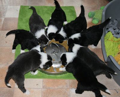 | Traditionell darf die Mama den Rest aus dem Futterring schlecken. Aber: Arme Mama, es bleibt schon jetzt nichts mehr übrig! Keine Sorge,Pepper,  wir finden schon noch etwas Gutes für dich! Darüber freuen sich dann auch wieder die Welpen, denn die sind glücklich, wenn Mama Pepper noch ein bisschen leckere Milch zum Nachtisch für sie produziert!