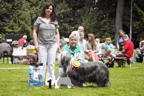 | Und das ist unser Jette-Schneckchen. Würden die Krankenkassen sie kennen, bekäme ich bestimmt bombastische Angebote: Davon abgesehen, dass sie ganz einfach ein superfeines Beardie-Mädchen ist, vertreibt sie selbst finsterste Depressionen! Wenn man nach 15 Minuten mit Jette nicht von selbst lacht, wird man beschmust bis man sich endlich nicht mehr zurückhalten kann! Die Ergebnisse von Oldenburg? Nicht so wichtig - wir haben Schleifen mit Zahlen von 1 bis 4, wobei mich das V1 von Philli besonders gefreut hat. Nein, es war schön zu sehen, wohin es geht mit den eigenen Hunden - und woher es gekommen ist!