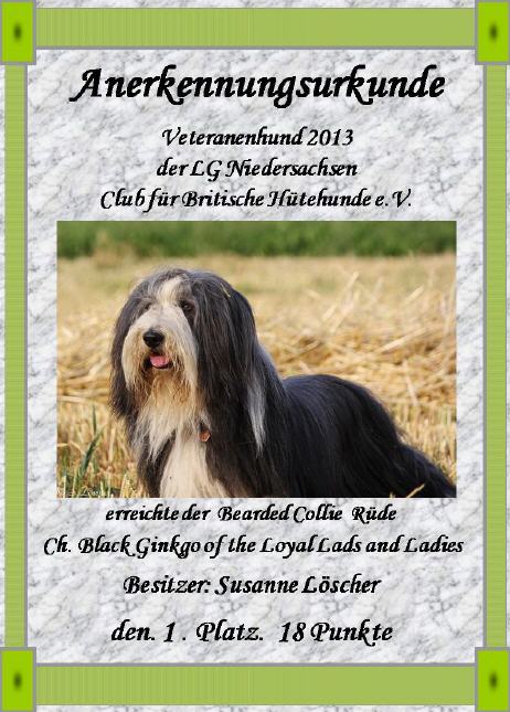 | Heute kam tolle Post von Susanne. Wie seit vielen Jahren wurde Gingko auch gestern wieder bei der Jahresabschlussfeier der Landesgruppe Niedersachsen geehrt. Neu ist allerdings, dass er diesmal als erfolgreicher Veteran gefeiert wurde.Ich glaube aber, dass Susanne sich noch mehr darüber freut, dass Gingko sich durch seinen Sohn Rasmus bei Löschers Zuhause täglich als erfolgreicher Vater präsentiert. Als wir heute mit Gingkos Schwester Gem, ihren Kindern Pepper und Quinn und drei Enkelchen an der Elbe waren, hat Siegrid wieder gesagt, dass es die Gs so toll sind - und damit natürlich auch deren "Brut"!