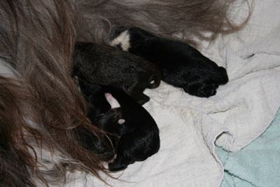 | Bereits letzten Samstag war das Haus voller vielversprechender Gäste: Vor der Ausstellung in Buchholz waren Summer in The City (Bambam) und Luna und ihre kleine Amy hier, um die Familie zu treffen, während ich mit der Vorbereitung der Ausstellung beschäftigt war. Bambam hatte am Sonntag Startnummer 1 und wurde von der Richterin für vielversprechend erklärt. Auch Pierre hat seine erste Ausstellung gut gemeistert und Bambam gut gezeigt. Für Luna gab es V2 - prima. Und Amy? Die hat ihrer Schwester Apple den Vortritt gelassen, die in einer großen Jugendklasse einen schönen 4.Platz gemacht hat!Aber nun zu den heutigen Gästen: