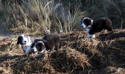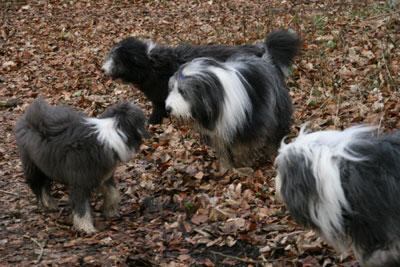 Paradebilder kann man zurzeit von unseren Hunden nicht machen: Abends spielt Jette ein Stündchen mit Quinn oder Nell und frisst ihnen dabei gefährlich knurrend das Fell ab. Beim Spaziergang rennt sie mit den Großen und beißt ihnen dabei in die Kragen. Also sehen alle ziemlich berupft aus. Aber die großen Hunde und wir Menschen gucken uns an und sagen: "Was soll's, solange die Kleine glücklich ist!"