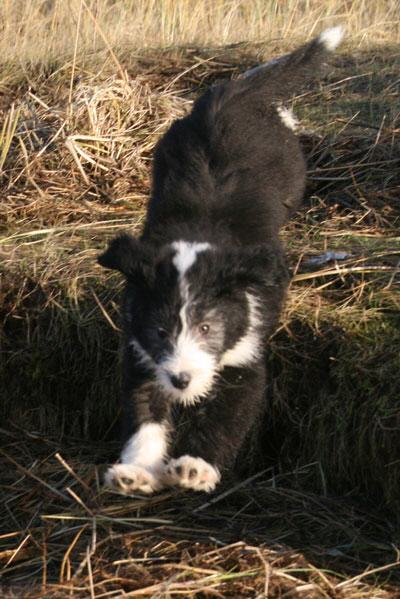 Am lustigsten war Tickety Boo: Der Bauer hat vor kurzem ca. 500 junge Apfelbäume gerodet. Folglich sind auf der Fläche nun 500 Löcher, ca 50 cm im Durchmesser und 7 cm tief. Da Ticky Boo es ja eilig hatte, hat er nur nach vorn auf die Schwanzenden er großen Hunde geguckt und nicht vor seine Füße. Ich schätze mal, er hat ca.50 Löcher getroffen! Danach hatte er ein Matschauge.Im wahrsten Sinne des Wortes, denn einmal hatte anscheinend seine linke Gesichtshälfte Kontakt mit dem lehmigen Rand des Loches.