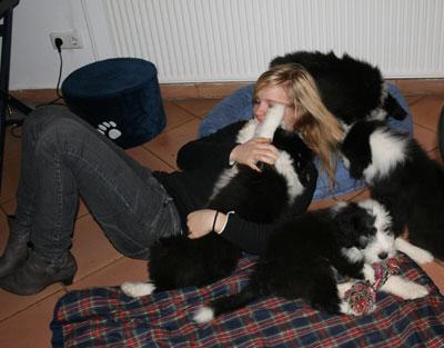 Charlotte hatte sogar selbst gebackene Kekse mitgebracht, die aber für die Kleinen noch etwas zu hart waren und mit denen wir heute die großen Hunde verwöhnen. Leider habe ich kein schönes Bild davon, wie Charlotte mit den Welpen spielt.
