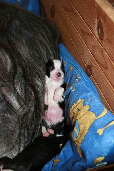 Nachdem in schneller Folge 4 kleine, aber gesunde Welpen zur Welt gekommen waren, kamen drei sehr leichte Welpen tot zur Welt. Bereits zu diesem Zeitpunkt war klar, dass noch weitere Welpen kommen würden, aber der Tierarzt und wir befürchteten, dass auch diese zu leicht sein würden.