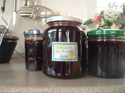 08:20 Oh, welche Gnade! Ich dürfte ausschlafen! Die Welpen waren zwar ganz früh schon einmal wach, haben aber nur zufrieden ein Weilchen gespielt und dann noch ein wenig geschlafen. Im Ställchen ist nur ein kleiner See und ein Häufchen, der Rest im Käfig, den sie diesmal tatsächlich als Klohäuschen benutzen. Also fix Welpen auf der Terasse gefüttert und Ställchen aprilfrisch gereinigt. Danach die Seenlandschaft von Paulas Spuckerei beseitigt. Nebenbei auf eigene Hygiene geachtet. Schnelles Frühstück mit Sohn und Gatten. Dabei wird ein Glas Johannisbeermarmelade geleert und der Gatte lässt die Bemerkung fallen, dass die diesjährigen Jo-Beeren bereits auf dem Boden vergammeln. (3 Gedecke)