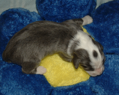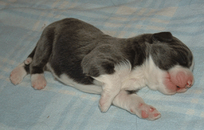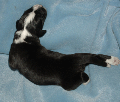 | Schauen Sie auf das rechte Hinterbein: er ist unterwegs! Wobei Louis und Leo eigentlich auch schon wissen, dass man mit den Hinterbeinen auch laufen kann. Übernächstes Wochenende ist die erste Wurfabnahme - vielleicht kann ich mit den beiden dann schon die Begleithundprüfung machen.