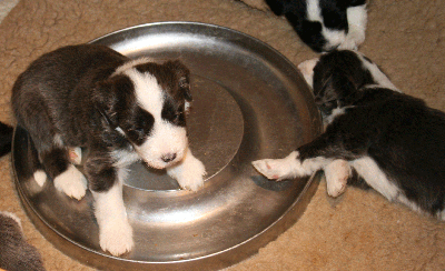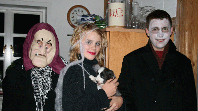 | Na, wenn das nicht Welpensozialisierung ist! Vormittags war Lea noch als ganz normales Mädchen zum Welpenknuddeln hier und nun plötzlich als Draculas Braut!Louis nimmt es gelassen - und nicht, dass ein falscher Eindruck entsteht: er ist natürlich nicht in der Schatztüte der Kinder gelandet sondern kümmert sich um sein Futter: