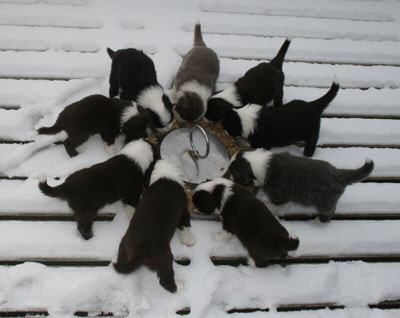 | Heute haben sich die Welpen fein farblich sortiert. Das braune Knäuelchen gibt es im Welpenkalender.