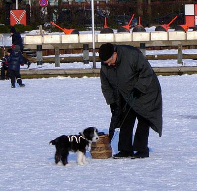| Das wird bestimmt mal ein historisches Bild: Wolke mit Herrchen auf derAlster! Wer weiß, ob die Alster noch msal so fest zufriert.Sie können sich vorstellen, dass sie viele Blicke und vermutlich auch Hände auf sich gezogen hat.