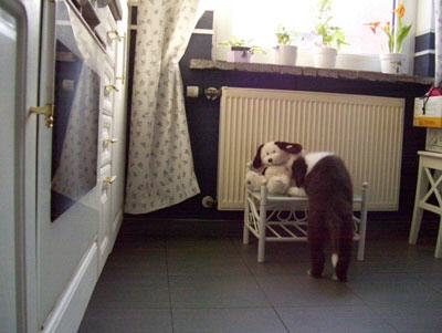 Es ist einfach zu wonnig! Sofort hatte er das Katzenklo gefunden, die erste Nacht konnte ich kaum schlafen, weil er so laut geschnurrt hat, er versucht Tinka zu verjüngen und nascht ein wenig aus den Hundenäpfen, während sie fressen.