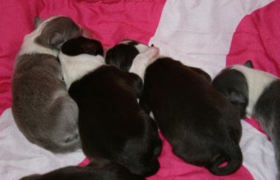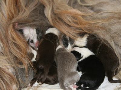 | Seit gestern Nachmittag liegen in der Wurfkiste sechs kleine Muckelchen. Wir waren ja schon ganz gespannt, was die schwarze Fine und der braune Louis uns für Farben bescheren würden. Ich hatte mit viel schwarz und ansonsten ein wenig von allem gerechnet. Wie es ist im Leben: Der Mensch denkt und..... Es sind drei blaue und drei braune Welpen, zwei Jungs sind blau und einer braun und bei den Mädchen ist es andersrum.