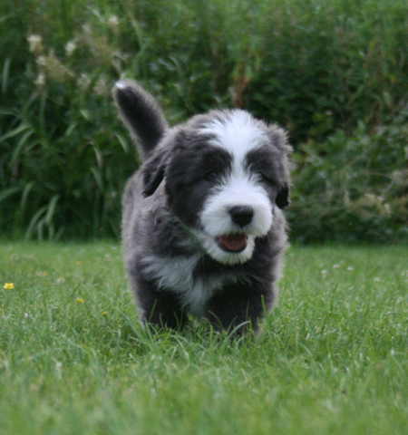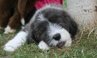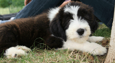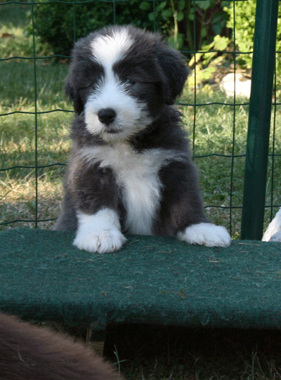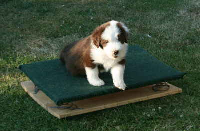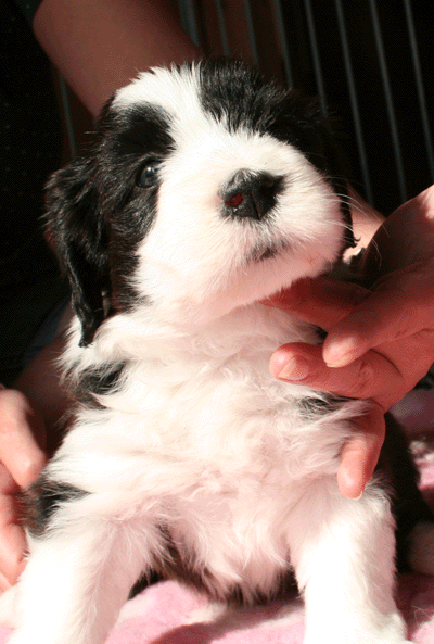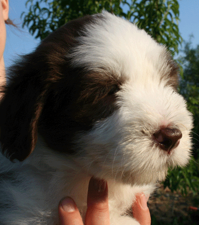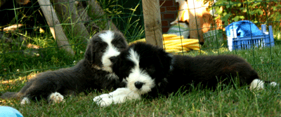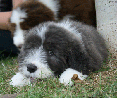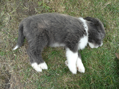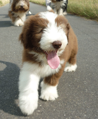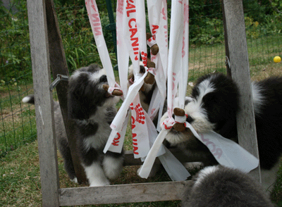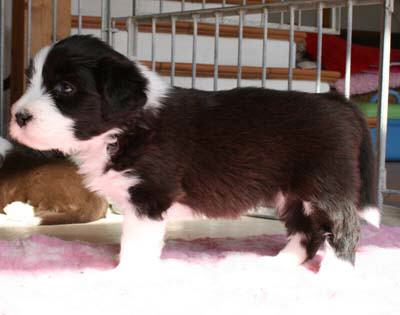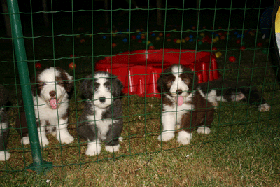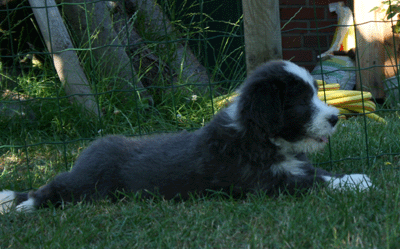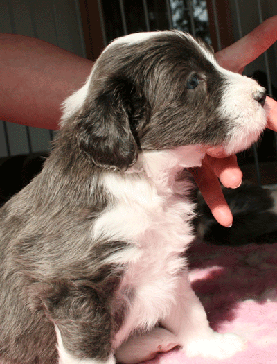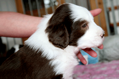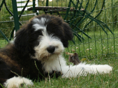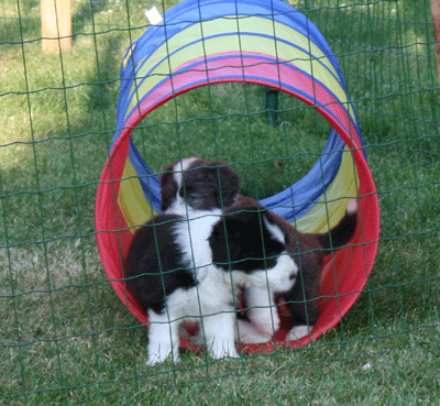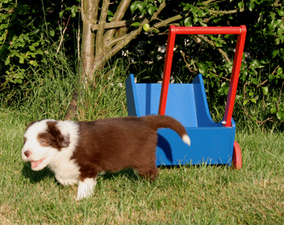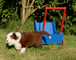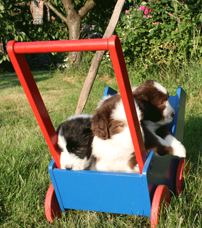 | Sie sind zur Zeit einfach reine Wonne! Wenn die Welpen wach sind, sind sie ständig auf der Suche nach neuen Erfahrungen. Sie spielen, toben, balgen sich. Wenn man sich ins Ställchen setzt, wird man angenagt oder "angemacht". Phileas Fogg kommt und rollt sich unter die Hand, damit man ihm das Bäuchlein krault, Pommeroy toucht wie seine Oma Amy und fordert mich zum Spiel auf, Patty schmiegt sich neben mich. Als Kind hatte ich einen Lieblingsspruch: "Der Teddy sitzt in seinem Ställchen und bürstet sich sein Bärenfellchen." So fühle ich mich, wenn ich bei den Kleinen im Ställchen sitze.