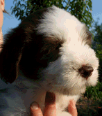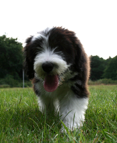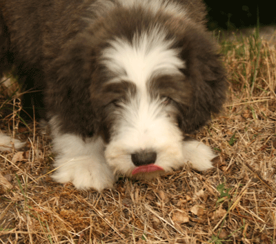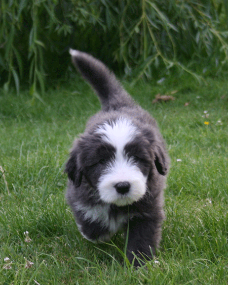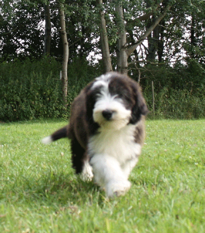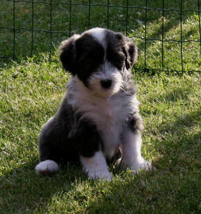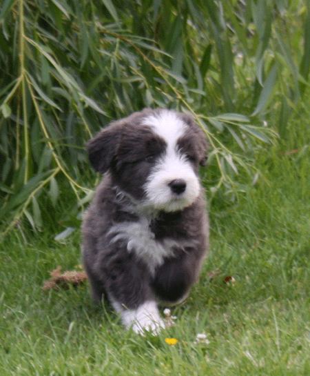 | Patty hat sich vorgenommen, schnell groß zu werden. Gestern hat sie die Augen richtig aufgemacht und sich gleich entschieden, auch kräftig laufen zu üben. Ganz behaarlich bewegt sie sich durch die Kiste - in einer Art vierfüßigem Liegestütz. Ich glaube. sie beeilt sich so, damit ihre neue Familie nicht mehr so lange auf Ersatz für ihren lieben alten Beardie warten muss.
