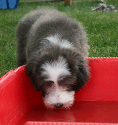 | Paddy hat das Wasserbecken entdeckt. Witziger war es noch, als er drin stand und versuchte, das Wasser mit den Pfoten rauszuschaufeln, aber da war gerade der Fotoapparat nicht da.