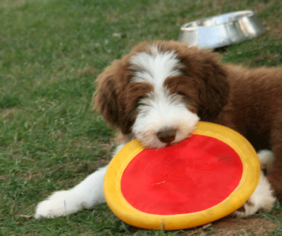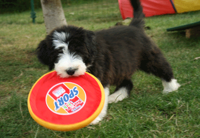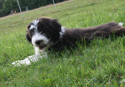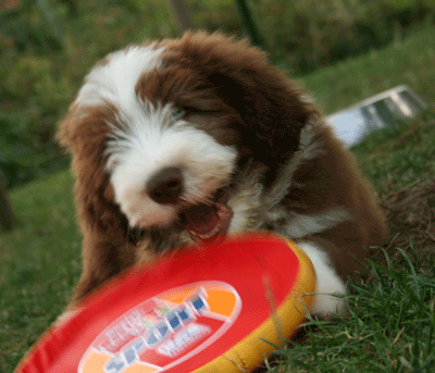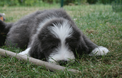 | Welpen sind wie kleine Kinder: Sie haben ständig neue Ideen, brauchen aber auch täglich neue Impulse. Heute war die flotte Scheibe dran. Die kann man schön schleppen und noch besser bekauen. Pommeroy findet es genaus toll wie Pennylane: