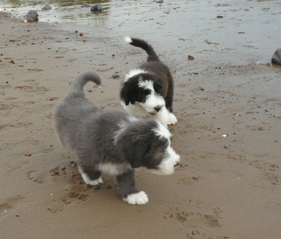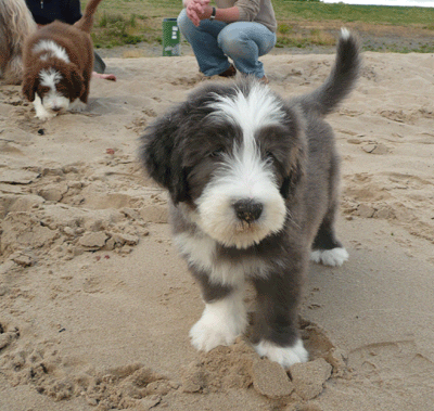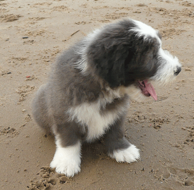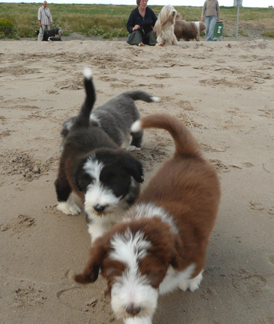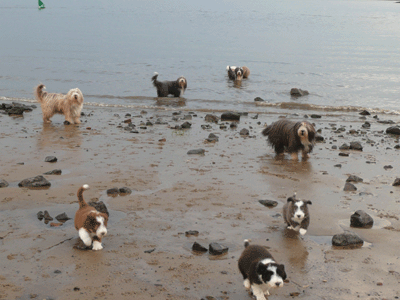 | Die Hunde mit den leicht geöffneten Schnauzen sind die Loyal Lads. Seien Sie froh, dass ich den Sound nicht eingespielt habe! Am Strand müssen unsere Hunde einfach vor Freude bellen.Und Sie können auch noch froh sein, dass India und Nell nicht vor Ihrem Bett geschlafen haben! Die beiden neigen dazu, sich nach einem Bad auch noch genüßlich zu panieren. Da hat man schon am Morgen Südsee-Feeling!