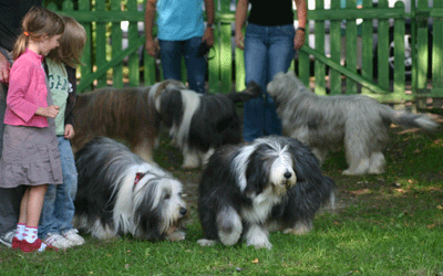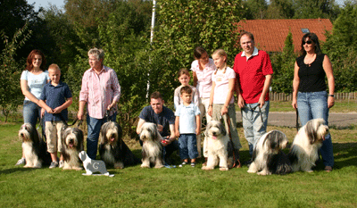 | Alle da - die treuen Gesellen! Auch aus den "sieben Zwergen" sind inzwischen wunderschöne, fast erwachsene Beardies geworden. Grace, Gershwin, Ginkgo, Nelly, Max, Gem und Sammy haben sich, seit sie aus unserem Haus zu ihren Familien gegangen sind, schon häufiger getroffen und man kann erkennen, dass sie und ihre Menschen solche Treffen genießen.Leider war Candy, die Mutter des C- und des J-Wurfs, nicht da. Urlaub! Sie kann so stolz auf ihre Kinder sein.