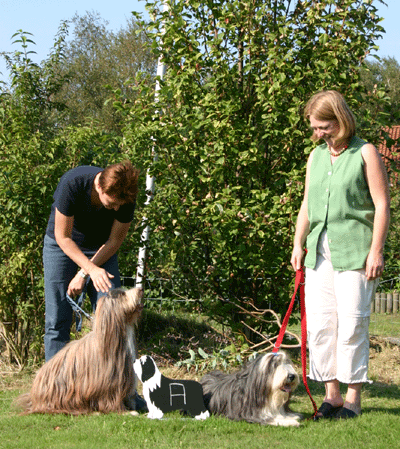 | Zu diesem Zeitpunkt waren nur zwei Vertreterinnen unseres ersten Wurfes zugegen: Nelly (Sweet Amber) und unsere Amy. Man kann sogar auf diesem Bild sehen, dass Nelly gleich zwei Superlative auf sich vereint: Unsere "Püppy" ist nicht nur unsere Kleinste, sondern auch unsere Braunste.Später kamen noch Artus und Lina Biermann zur Verstärkung ihrer Geschwister.