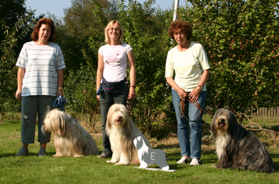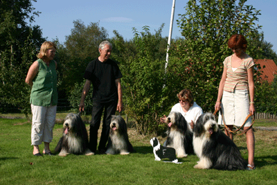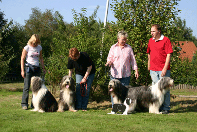 | Finn, Fine, Frowin und Fenwick: Alle vier große, kräftige Beardies, die ihrem englischen Vater in Deutschland Ehre machen. Der fawn-farbene Bruder Fluffy teilte mir per mail mit, dass er von seinem wohlverdienten Urlaub unabkömmlich sei und Faye durfte ihr Frauchen auf Dienstreise begleiten.