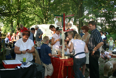 Als wir um 13 Uhr zum Aufbauen kamen, hatten Hartmut Ohsenbrügge und Böhmers schon wie die fleißigen Heinzelmännchen viele Bierzeltgarnituren und den großen Grill aufgebaut. Noch ein ungläubiger Blick zum Himmel: Nein, auch die Zelte brauchten wir nicht aufbauen. Der Himmel war so strahlend blau, dass in den nächsten Stunden nicht mit einer Wetteränderung zu rechnen war.