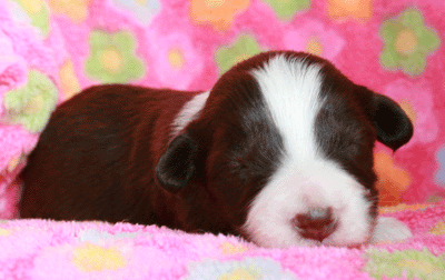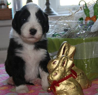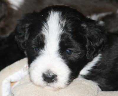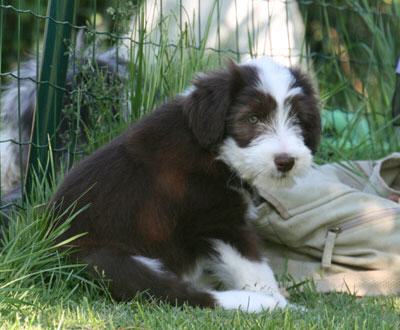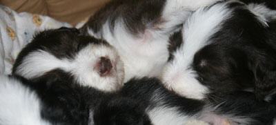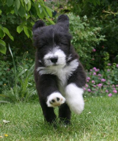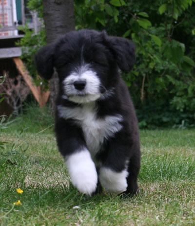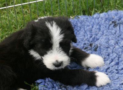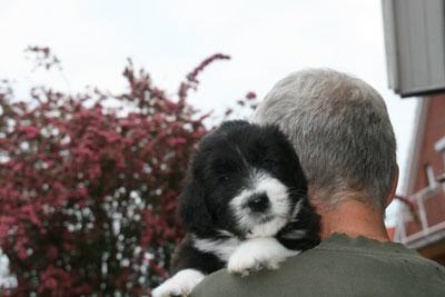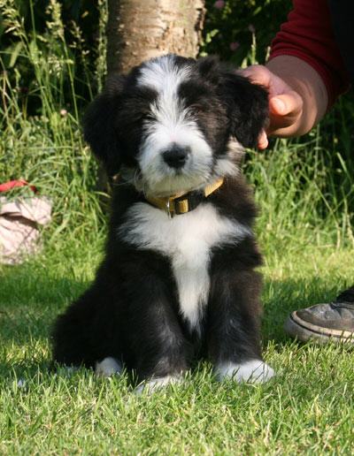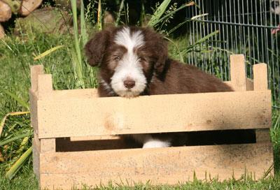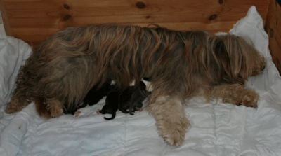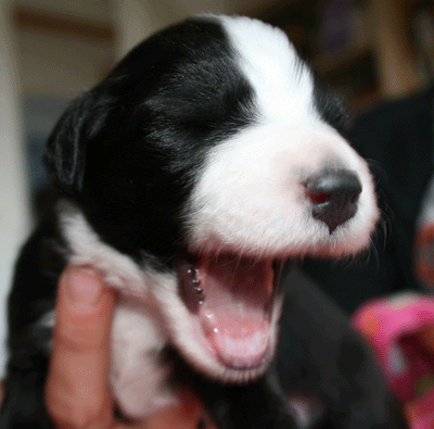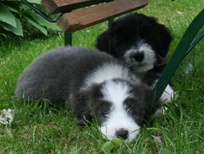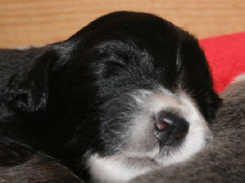 | Den Welpen geht es gut, sie wachsen und gedeihen. Jetzt sind alle im Rouladenstadium. Wenn Sie je einen 10 Tage alten Beardie-Welpen in der Hand hatten, wissen Sie, was ich damit meine: Am Anfang sind die kleinen Lebewesen zart, länglich, zerbrechlich. Und dann plötzlich werden sie ganz fest und rundlich. Halt wie ein schöne, prall mit Speck und Gurken gefüllte Fleischroulade. Allerdings ist der Duft ein ganz anderer (nix gegen leckere Rouladen!)- und diese wunderbare Wärme, die meiner Meinung nach die beste Therapie gegen kranke Seelen und arthritische Hände ist.