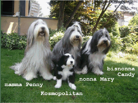 | Der kleine Schwarze ist der Papa der Welpen, Philabeg Kosmopolitan. Wie es sich gehört für einen kleinen italienischen Bub wird er wohl behütet von Mutter, Großmutter und Urgroßmutter. So war es damals - und nun hat er schon selbst so kleine Goldstückchen: