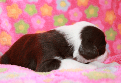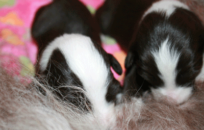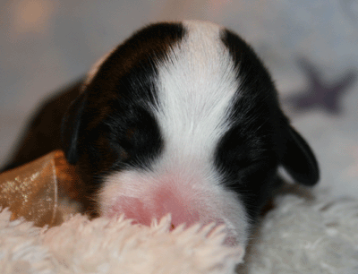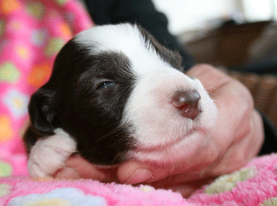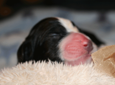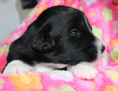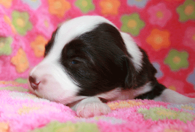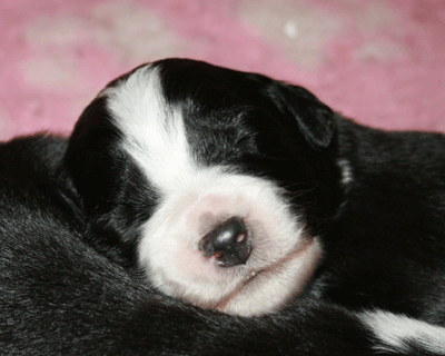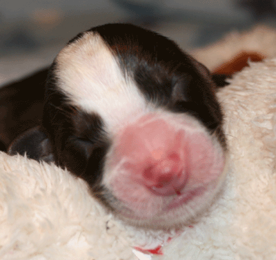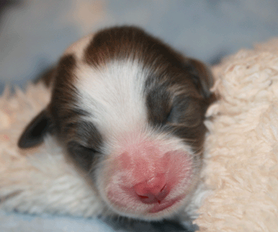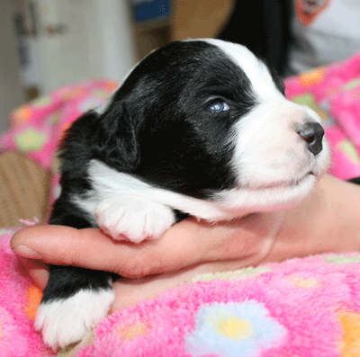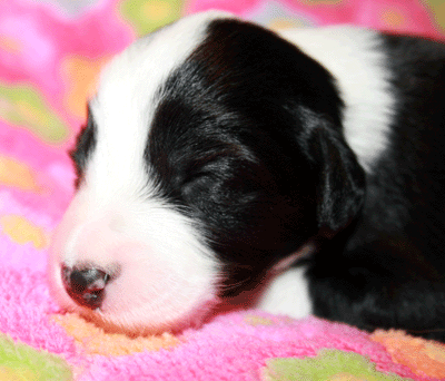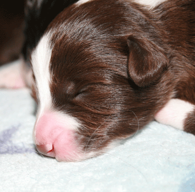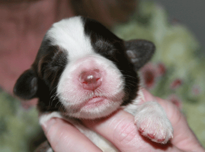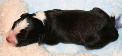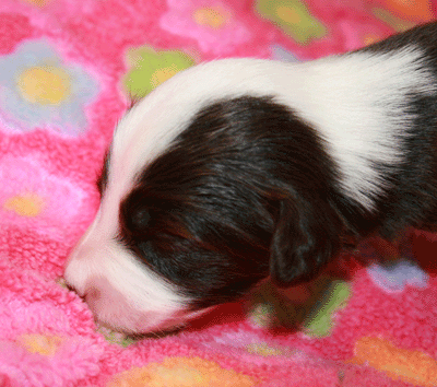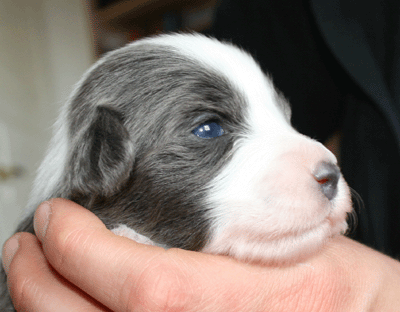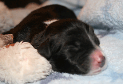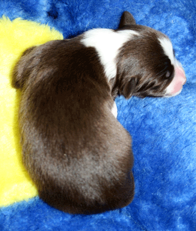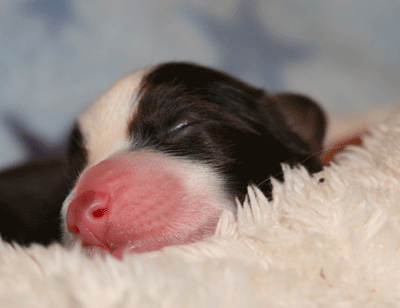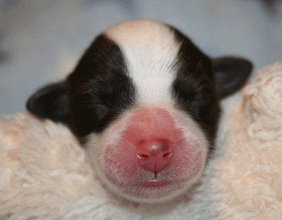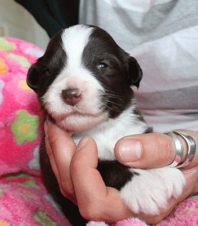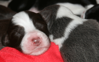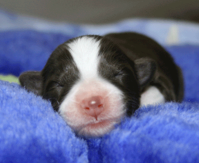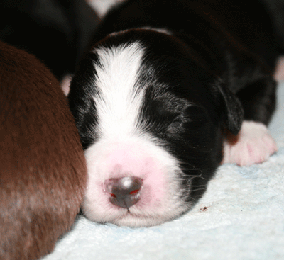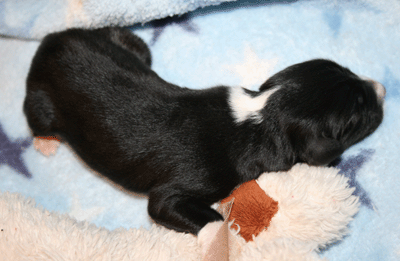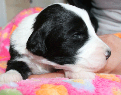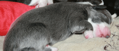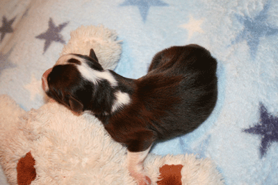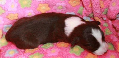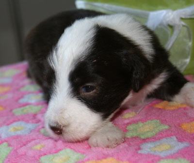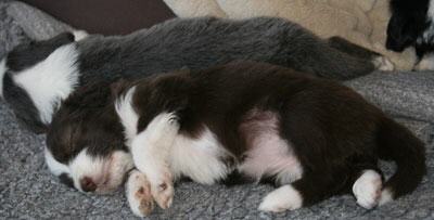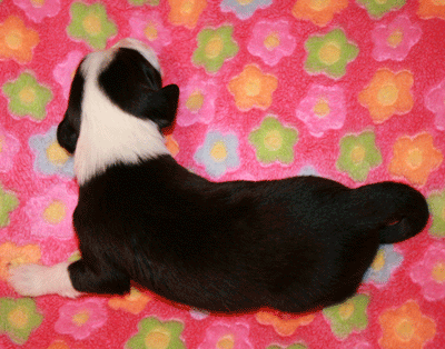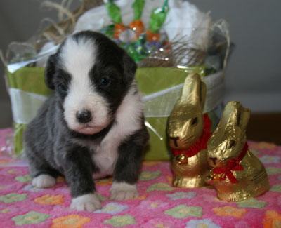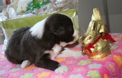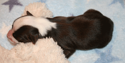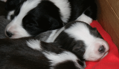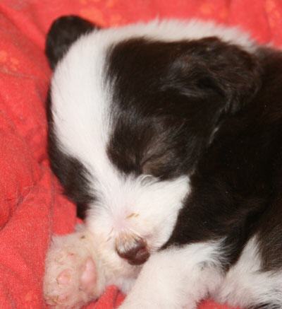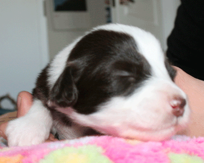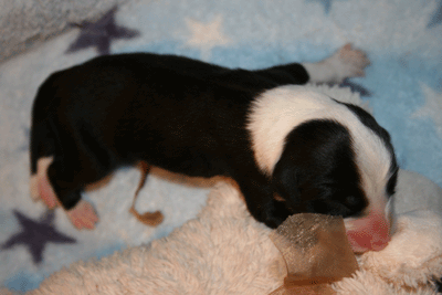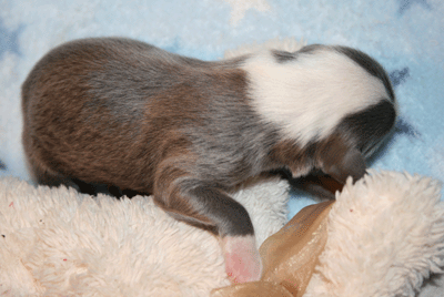 | Die kleine Blue entwickelt sich zu unserem Augenstern. Sie ist die kleinste und die lebendigste. Einmal hat sie schon den Weg aus der Kiste gefunden. Vorhin schaute ich, was so an Mamas Bauch zappelt: Blue! Sie lag auf ihren Geschwistern - auf dem Rücken und versuchte zu trinken. Ich glaube, die schicke ich bald zusammen mit Pepper zu Tine in die Welpenstunde!
