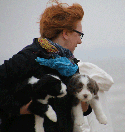 | Wenn die Welpen alt genug sind, heißt die Regel so viele Welpen wie Beifahrer dürfen am Sonntag mit zur Elbe. Und dabei geht ein ganz großes Dankeschön an Siegrid und Jürgen, denn Siegrid fragt immer schon vorher, wer denn bei ihnen mitkommen soll. Heute waren es Hannes bei Rixa und Fiete, Bobby bei Jütren und Siegrid und Fee in meinen Armen als Beifahrerin bei Iris.Ein großes Dankeschön? Warum denn das? Es ist doch bestimmt schön, einen kuscheligen Welpen auf dem Arm zu haben! Ja, ist es! Solange, bis der Welpe einem das Futter der gesamten letzten Tage in den Ausschnitt spuckt! Siegrid kennt dieses Risiko schon und ist immer mit schützenden Handtüchern ausgerüstet.