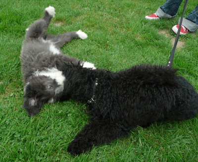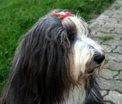Wir haben gerade letztens über die BH gesprochen und Moses bestärkt mich, dass unsere Theorie richtig ist: wer mit seinem jungen Beardie trainiert, sollte die erste Chance zur Prüfung nutzen. Dann hat der kleine, überschäumende Clown noch Spaß an solchen Übungen. Je länger man trainiert, desto schwieriger wird es. Ich glaube, das liegt daran, dass der erwachsen werdende Beardie sich ernstlich fragt, warum sein Herrchen oder Frauchen die hunderste Wiederholung von etwas sehen möchte, das er doch schon beim zehnten Mal (oder eher?) konnte.