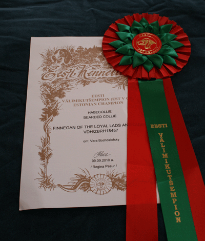 | Heute kam Post aus Tallinn und nun ist Finn auch EESTi VÄLIMIKUTSEMPION. Ich glaube, das heißt "estnischer Champion". Wir sind stolz auf unseren Schleifensammler.