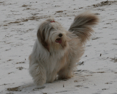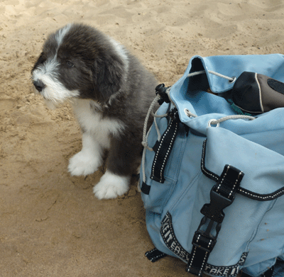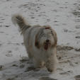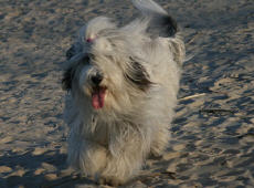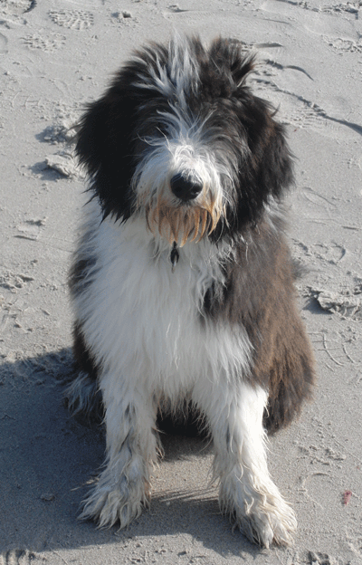 | Wie Sie sehen wird auch Penny groß. Sie schaut schon wie ein echter Bochda-Beardie. Und scheint sich am Strand, im Sand, wohlzufühlen.