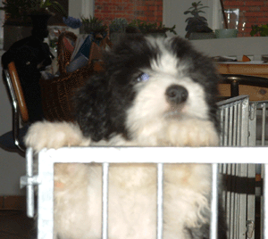 Hier ist Isleen auf den Hocker, der den Welpen als Häuptlingsfelsen dient, geklettert und schaut über den "Teller"rand. Demnächst machen sie bestimmt Räuberleiter und klettern raus. Ich weiß noch, wie wir beim ersten Wurf dachten, wir könnten ein Gehege bauen, das der Hündin selbstständiges Rein- und Rausspringen ermöglicht und die Welpen gut behütet (so etwa 55 cm). Dieser Zaun ist knapp 80cm hoch! Das ist natürlich für einen Beardie kein Hinderniss, aber unsere Hündinnnen schätzen es nicht, in das Gehege zu springen, weil sie da immer auf einen Welpen springen könnten. Falls mal ein Welpe schreit, sind sie allerdings sofort da.